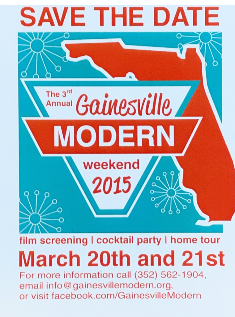 2015 – Third Annual Mid-Century Modern Home Tour 1960 – Gainesville Country Club, 6812 SW 35th Way, Gainesville, Florida1967 – Fitzpatrick Residence, Architects Lester May and Jack Moore, Gwynn Oaks Neighborhood, 4420 Clear Lake Drive, Gainesville, Florida1966 – Block Residence, Black Acres Neighborhood, 2906 SW 2nd Avenue, Gainesville, Florida1962 – Clark Residence, Builder Jack Clark, Libby Heights Neighborhood, 1004 NW 34th Street, Gainesville, Florida1964 – Weil -Cassisi Residence, Architect Harry Merritt, Colclough Hills Neighborhood, 3105 SW 5th Court, Gainesville, Florida1950 – Flowers Residence, Architect M.H. Johnson, Kirkwood Neighborhood, 2815 SW 8th Drive, Gainesville, Florida JGI General Construction Clarrisa Carr Graphic Designe